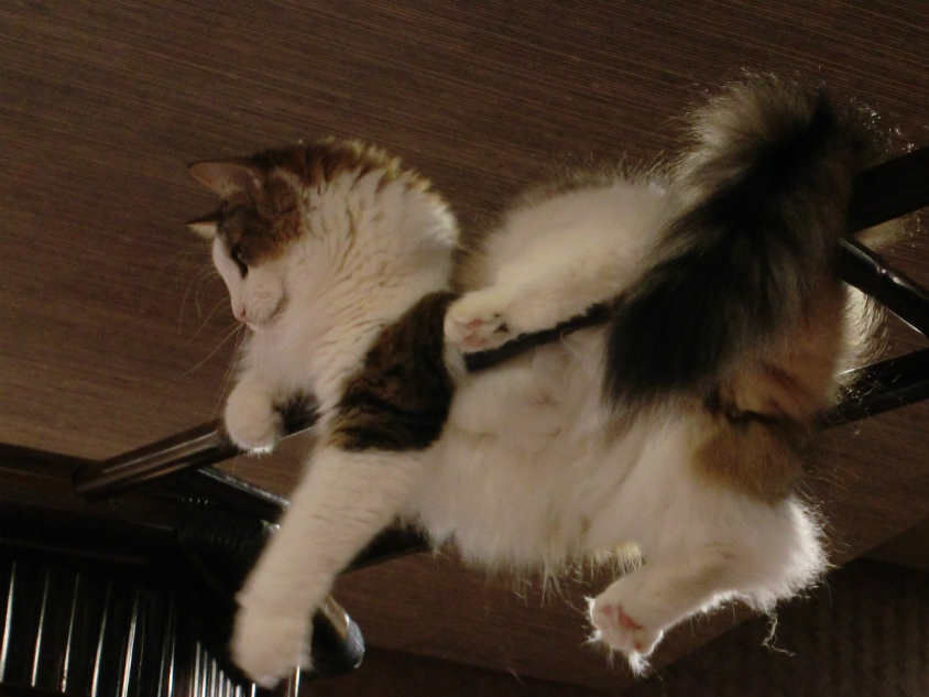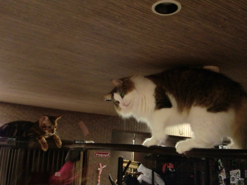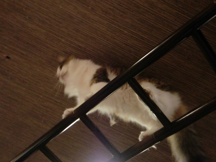 キャットタワーをつなぐ梯子みたいなところで遊んでました。