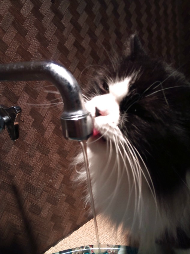 のどが渇いたらしくて、水道のところにいたので、水を出してあげました。