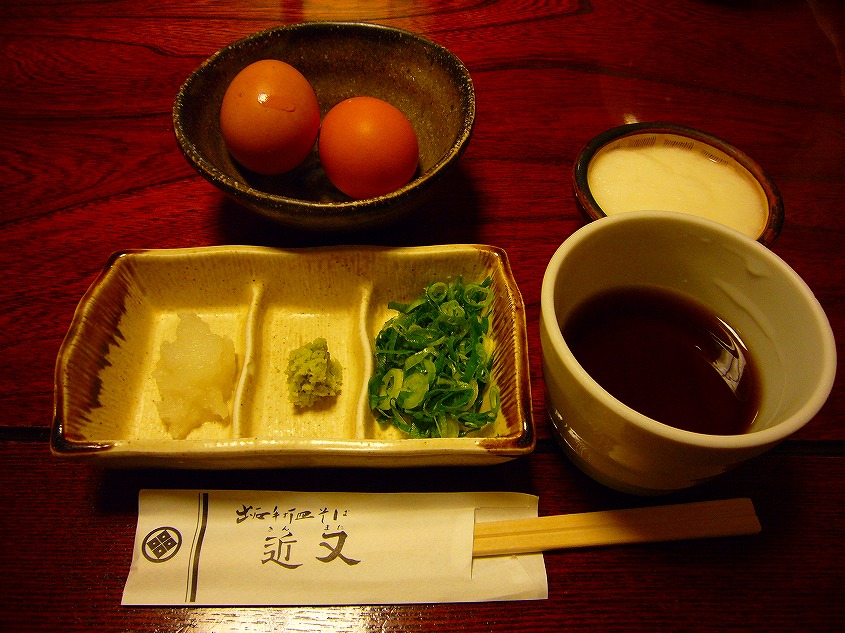 僕のお勧めの食べ方はまず、薬味の大根おろし、ねぎ、ワサビを入れて食します。