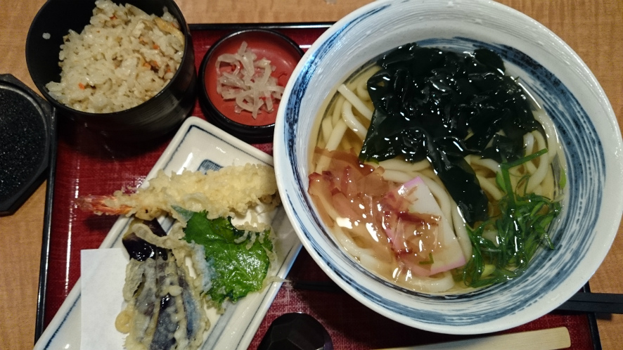 席につき注文したのは天ぷらうどんのかやくご飯がついたセット。
