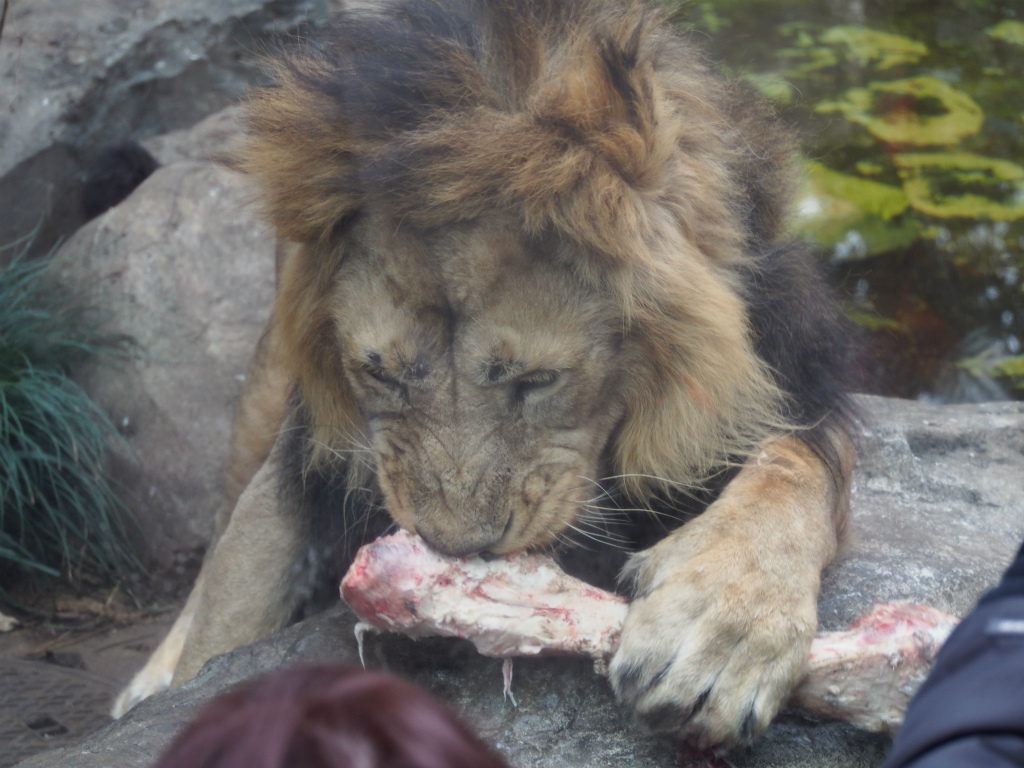 猛禽類エリアを過ぎると次はライオンです。朝ごはんだったのかおやつだったのかはわかりませんけど骨をかじっていました。